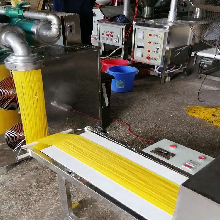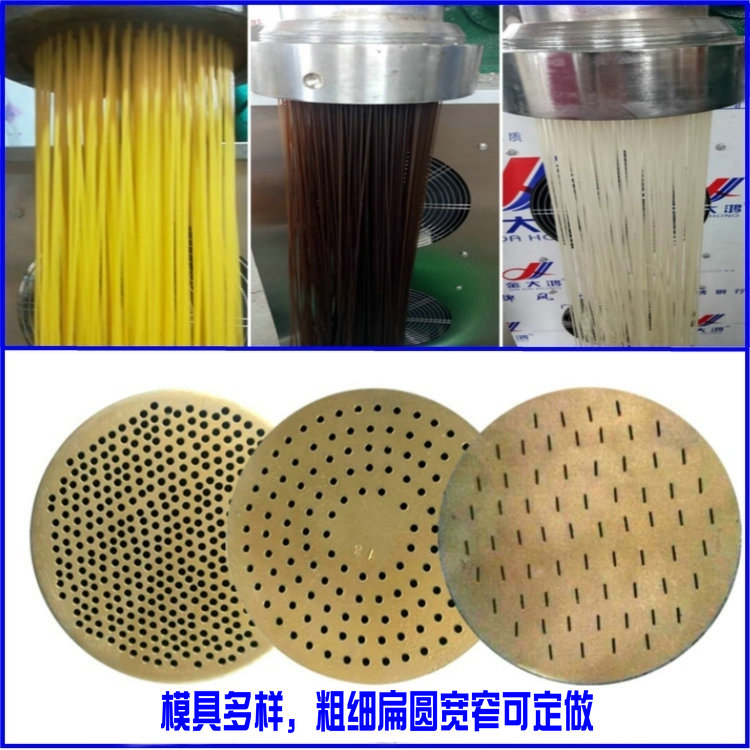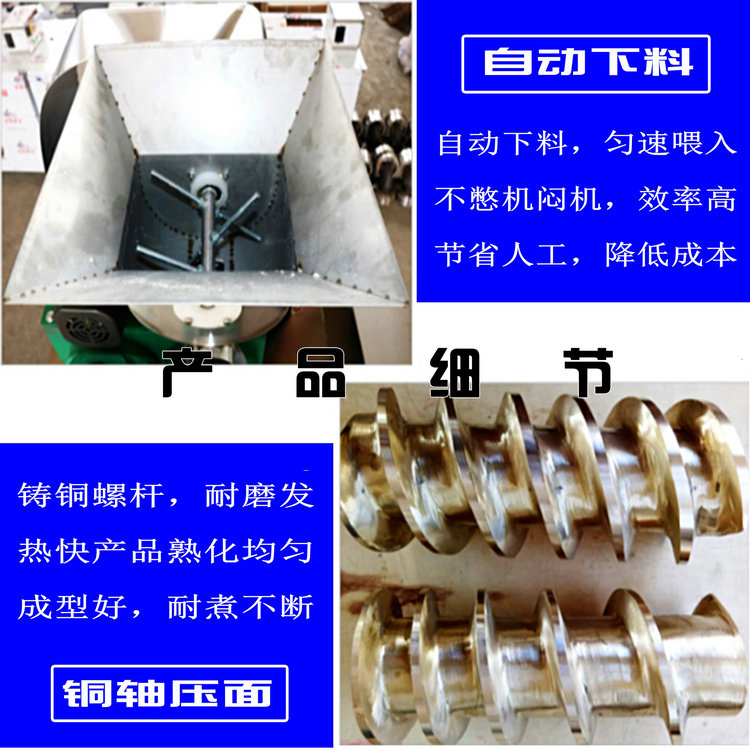 天華自熟冷面機(牛筋面機)結(jié)構(gòu)合理,造型美觀,由自動下料器、雙銅軸壓面機、數(shù)控切斷機組成,自動下料器由調(diào)速電機帶動,通過快慢速度調(diào)整喂料的多少,壓面機采用螺旋擠壓生物變性工藝,無需外加熱源,利用軸筒旋轉(zhuǎn)與原料摩擦揉擠產(chǎn)生的熱能,使原料到成品一次熟化成型,將玉米面、蕎麥面、小麥面等雜糧面通過冷面機綜合轉(zhuǎn)化成具有柔韌彈性特點的風味面食,更換不同的的模具可以加工不同粗細寬窄的形狀,產(chǎn)品外表光滑、柔軟可口、久煮不糊,保留原糧的特有營養(yǎng)成分和微量元素。自熟冷面機還可生產(chǎn)鋼絲面、牛筋面及各種雜糧面條等。成型的面食進入調(diào)速皮帶輸送機,由延時控制切斷裝置把面條切成所需的長短后即可包裝銷售。